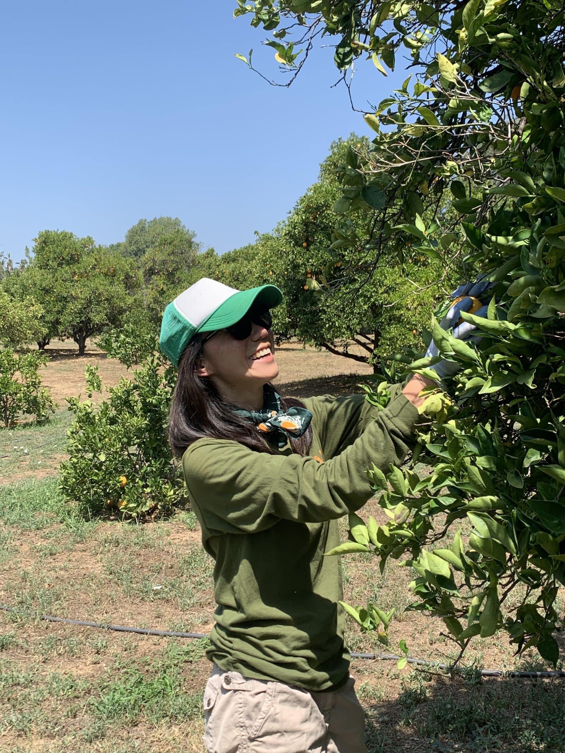 Screenshot of news site with headline and cover image of woman smiling and picking citrus from a tree